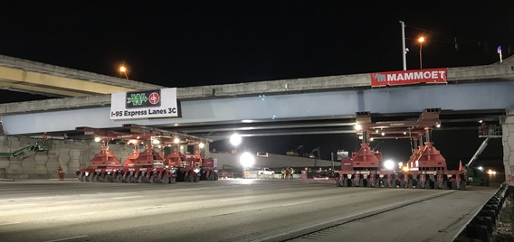 Six trains of eight-line self-propelled modular transporters equipped with 250-ton jacks hoisted the bridge off its abutments in May for relocation south along I-95 to an offramp for demolition. This approach took just three hours, reducing disruption to traffic by several weeks' time.