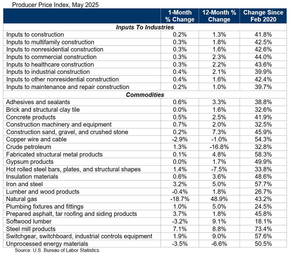- Input prices are now 1.3% higher than a year ago overall, and 1.6% higher for nonresidential construction, with tariff-related price increases largely offsetting declines in energy costs. On an annualized basis, however, costs climbed 6% through May.