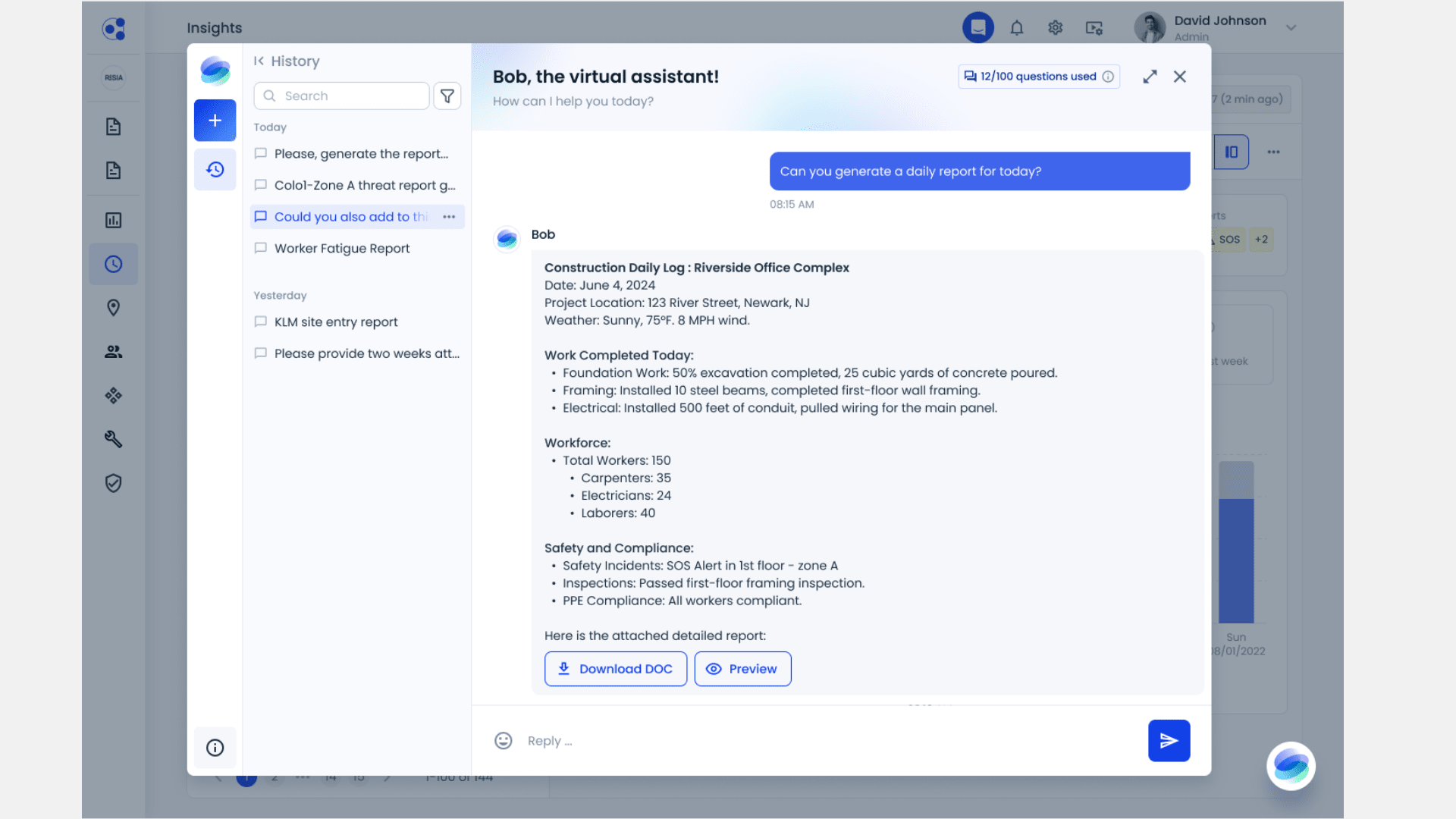 Kwant team has been working on the AI-based bot to copilot the report generation using LLM. Our customers have various reporting requirements, from prevailing wage reports to proximity reports of safety incidents, theft, and vandalism. Kwant has released the beta version of the LLM-based chatbot - “Bob - the AI Assistant.” The first version of Bob can answer questions related to the workforce, like filtering for fatigued workers, determining which access points are most active, etc. This saves hours every week of the superintendent’s time.