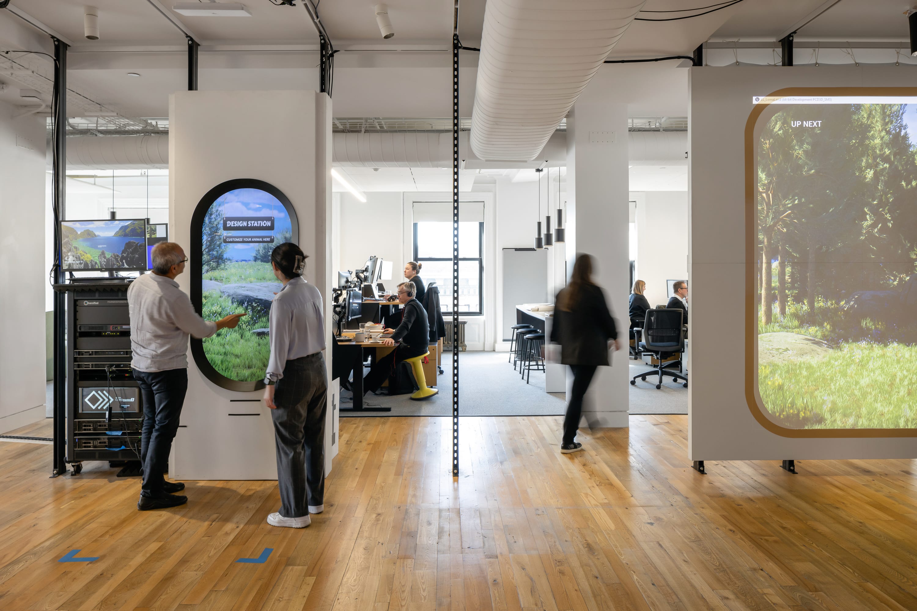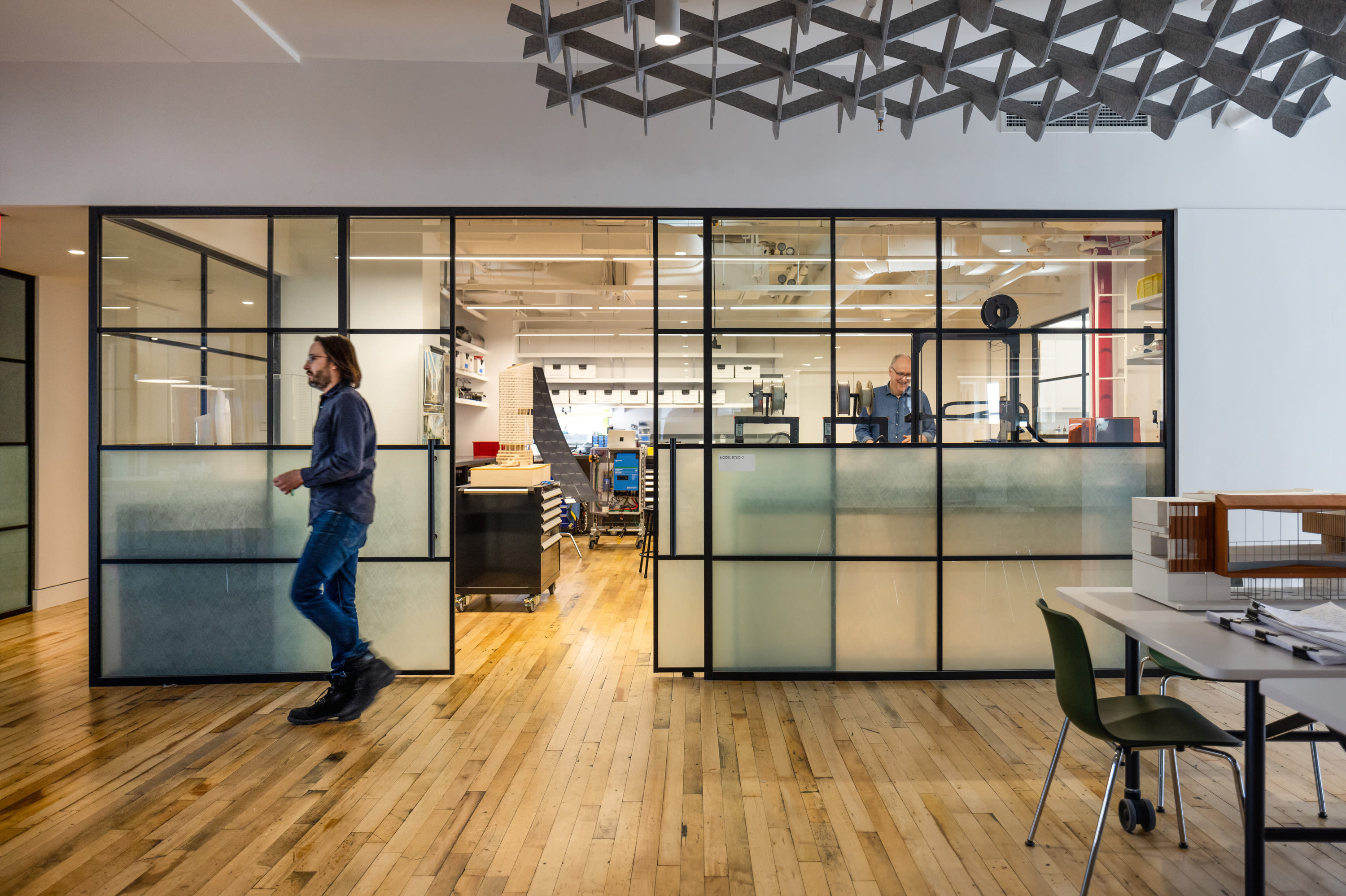 In the R&D lab, NBBJ's team develops their 3D models and builds mock-ups, demonstrating the firm's dedication to leading-edge design and innovation. This forward-thinking approach is epitomized by the Igloo, a 270-degree projection room on the 11th floor where clients can experience 3D tours of their projects, and the adaptable Unistrut system installed by JRM that allows for a dynamic display of project mock-ups.